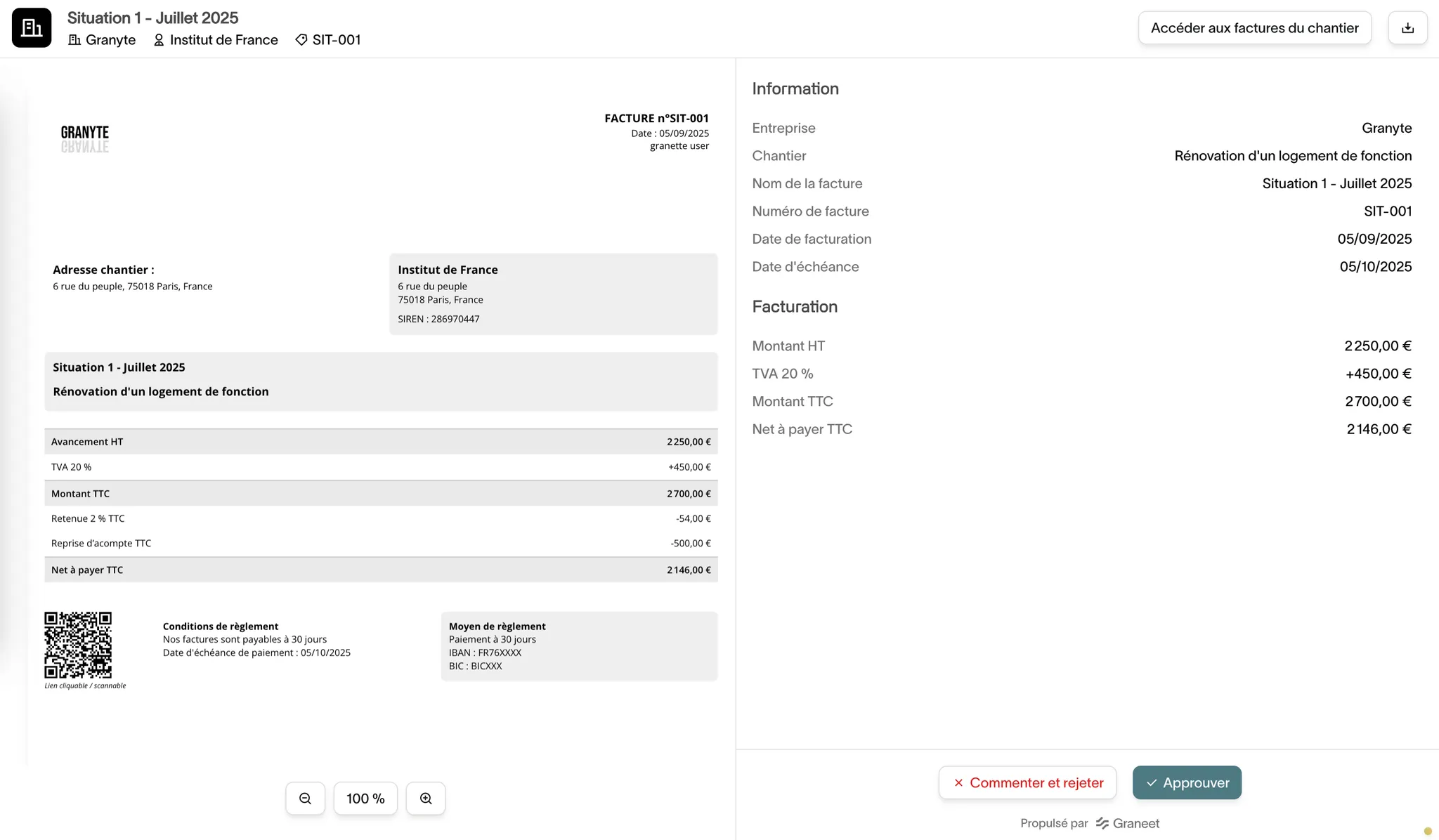 L’interface de consultation des factures et de validation des situations est accessible via un lien public, propre à chaque facture.
