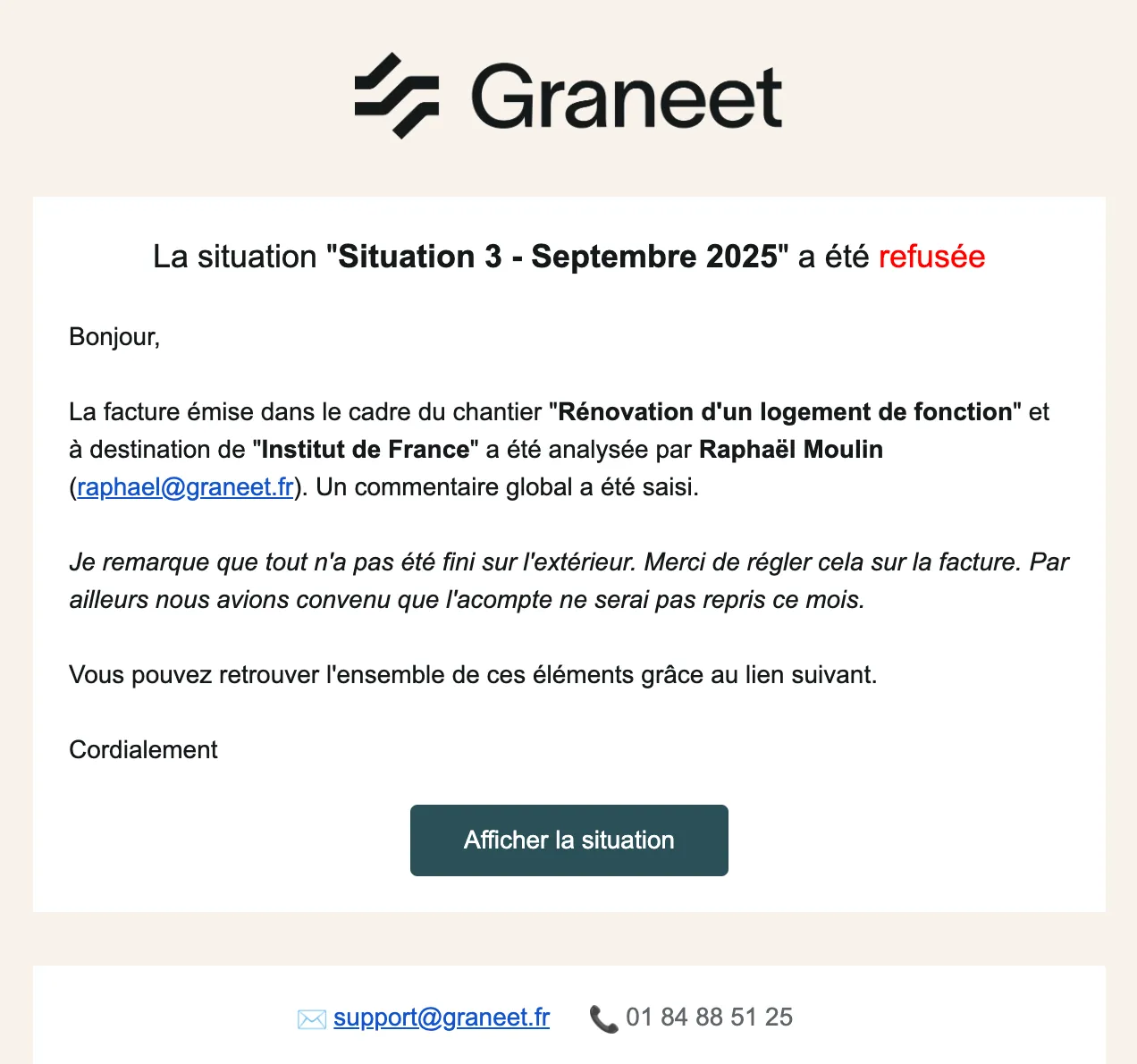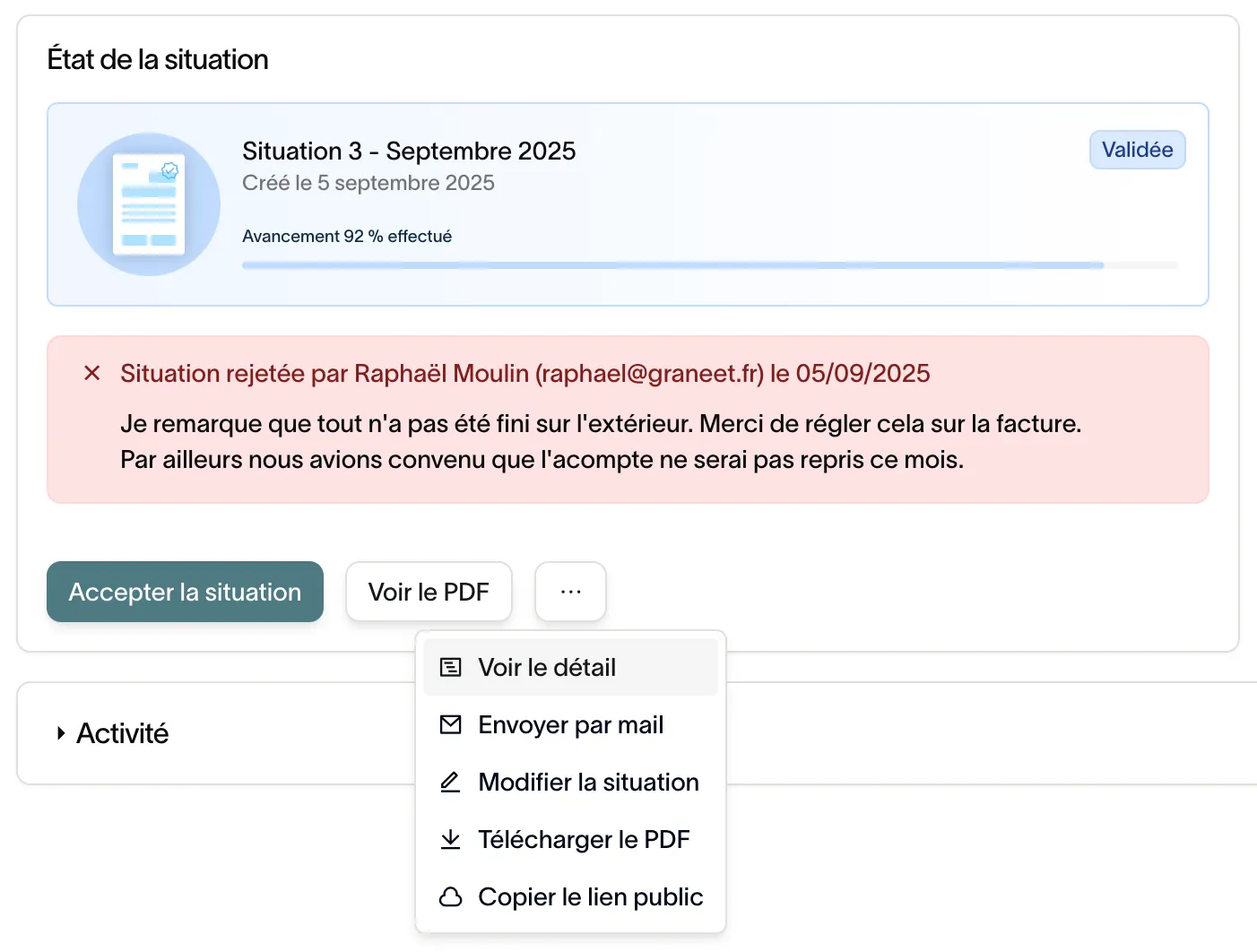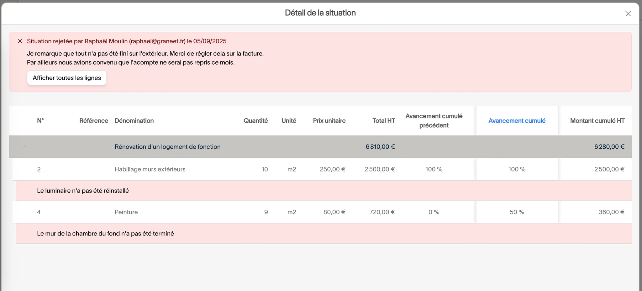 Dans le cas d'un rejet de situation, vous aurez la capacité de voir les commentaires laissés par votre client en cliquant sur Voir le détail