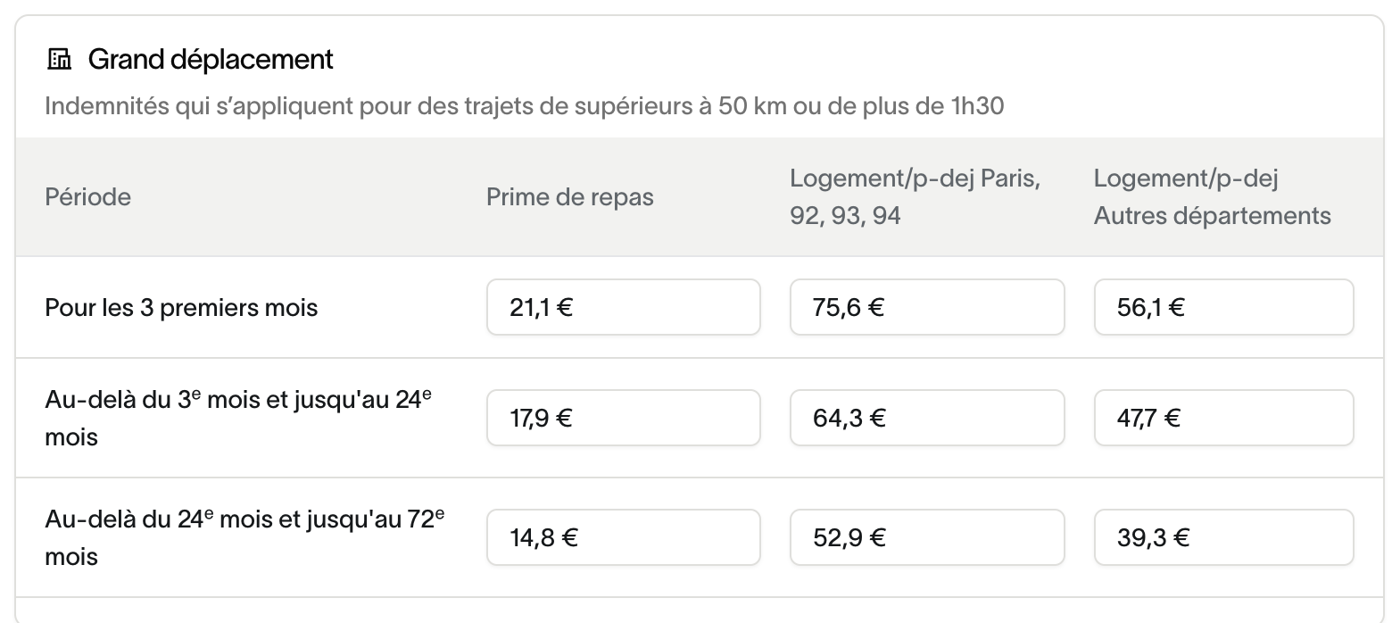 - 💰 Indemnités : paniers-repas, petits ou grands déplacements, trajets, transports…