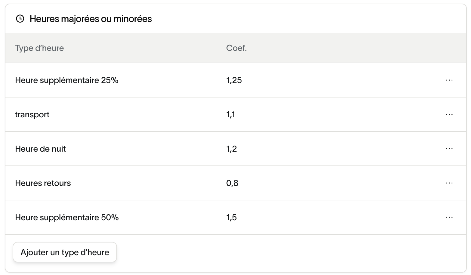 Les types d’heures se configurent également dans les paramètres d’entreprise.