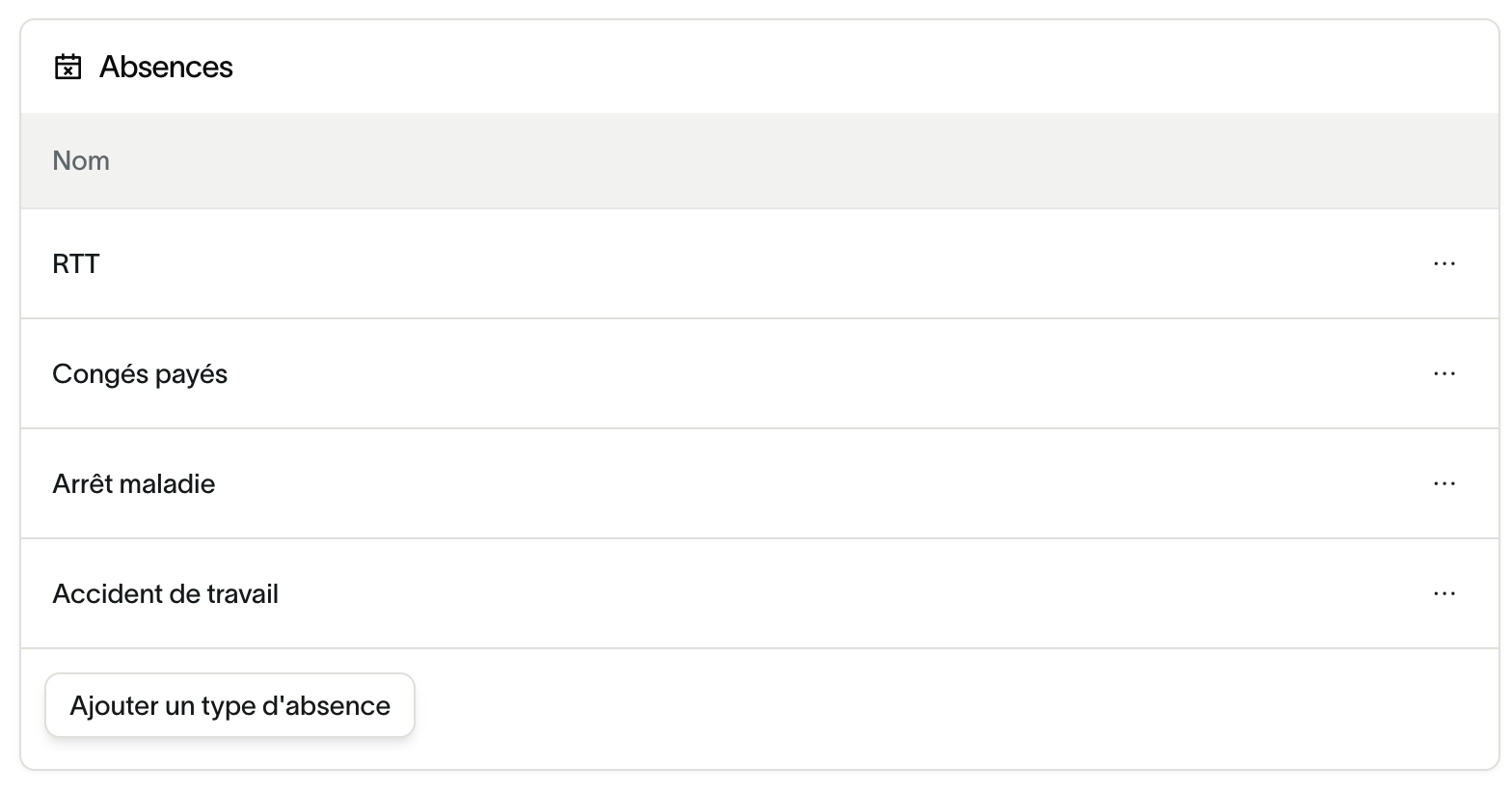 Les types d’absence sont configurables dans les paramètres d’entreprise.
