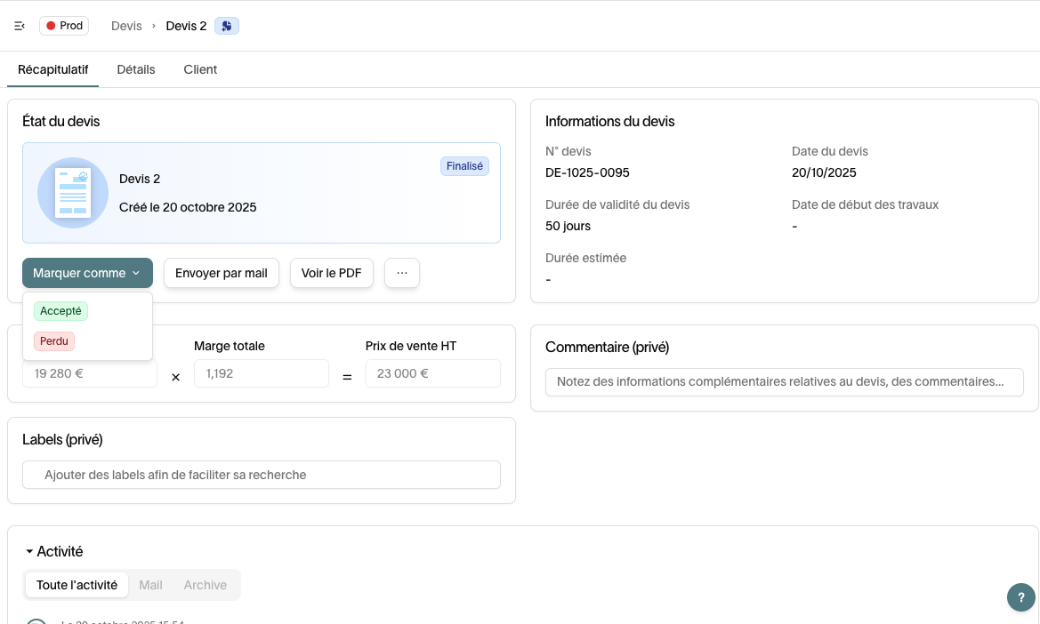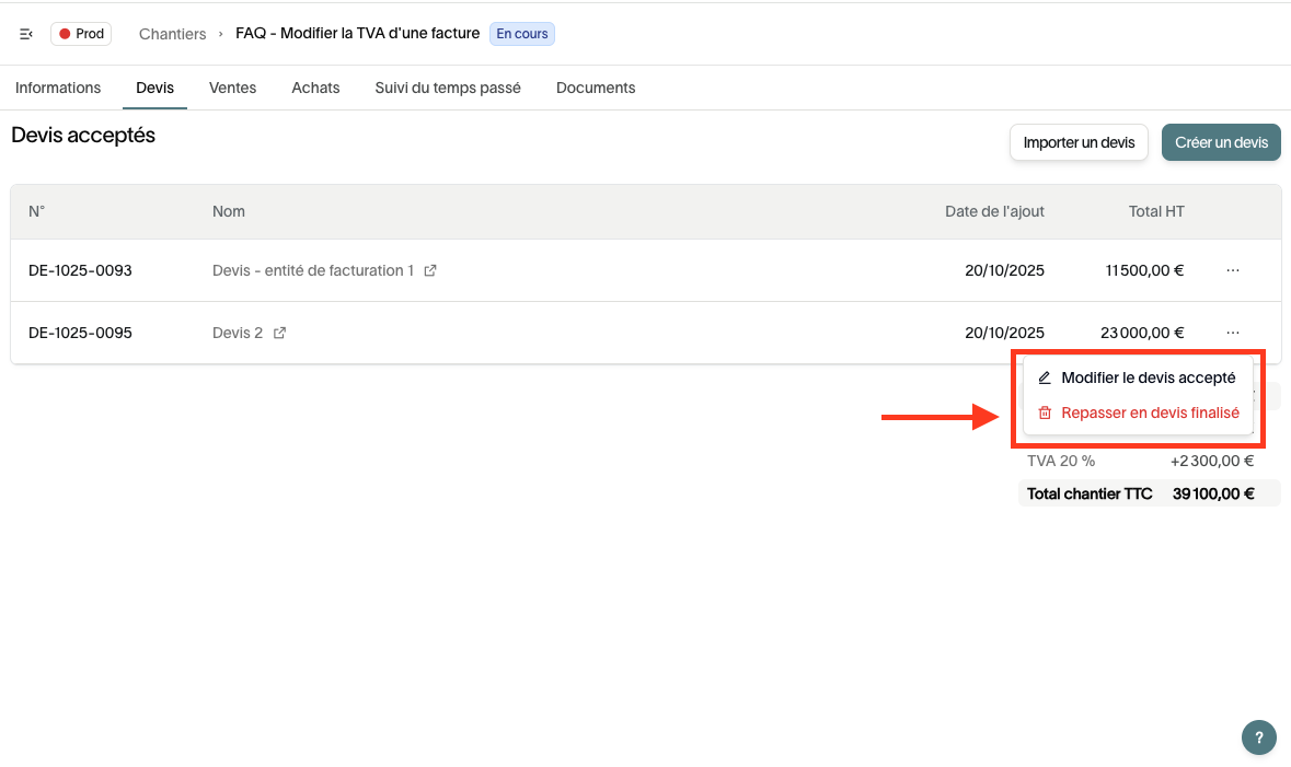 Vous souhaitez modifier l’entité de facturation associée à un devis ? Rien de plus simple : cette opération s’effectue directement depuis le chantier concerné.