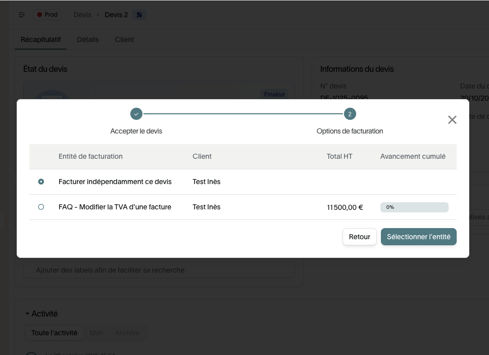 Facturer indépendamment ce devis— le devis sera facturé séparément, cela créera une nouvelle entité de facturation propre à ce devis.Relier le devis à une entité de facturation existante— le devis apparaitra sur la même facture que le devis déjà accepté.