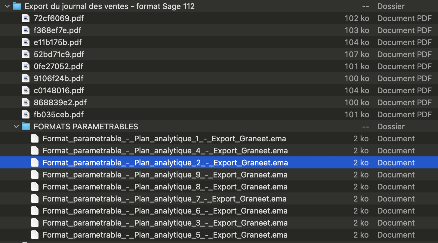 | Dossier de format paramétrable (.ema) | Fichiers de paramétrage requis par Sage pour l’import avec analytique. |