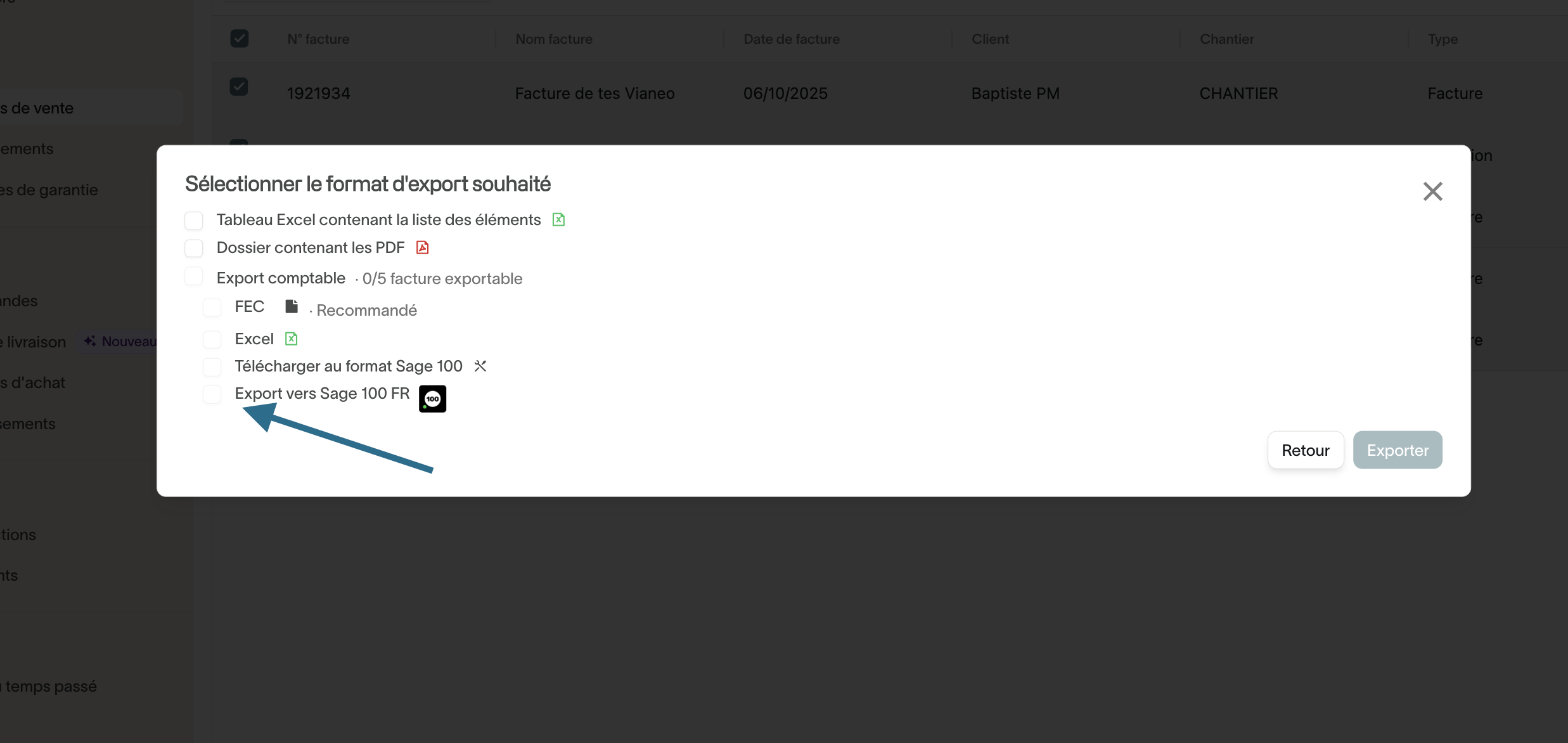Sélectionnez les factures de vente, facture d'achat, encaissement ou décaissements, puis transmettez en un clic les écritures à Sage 100.