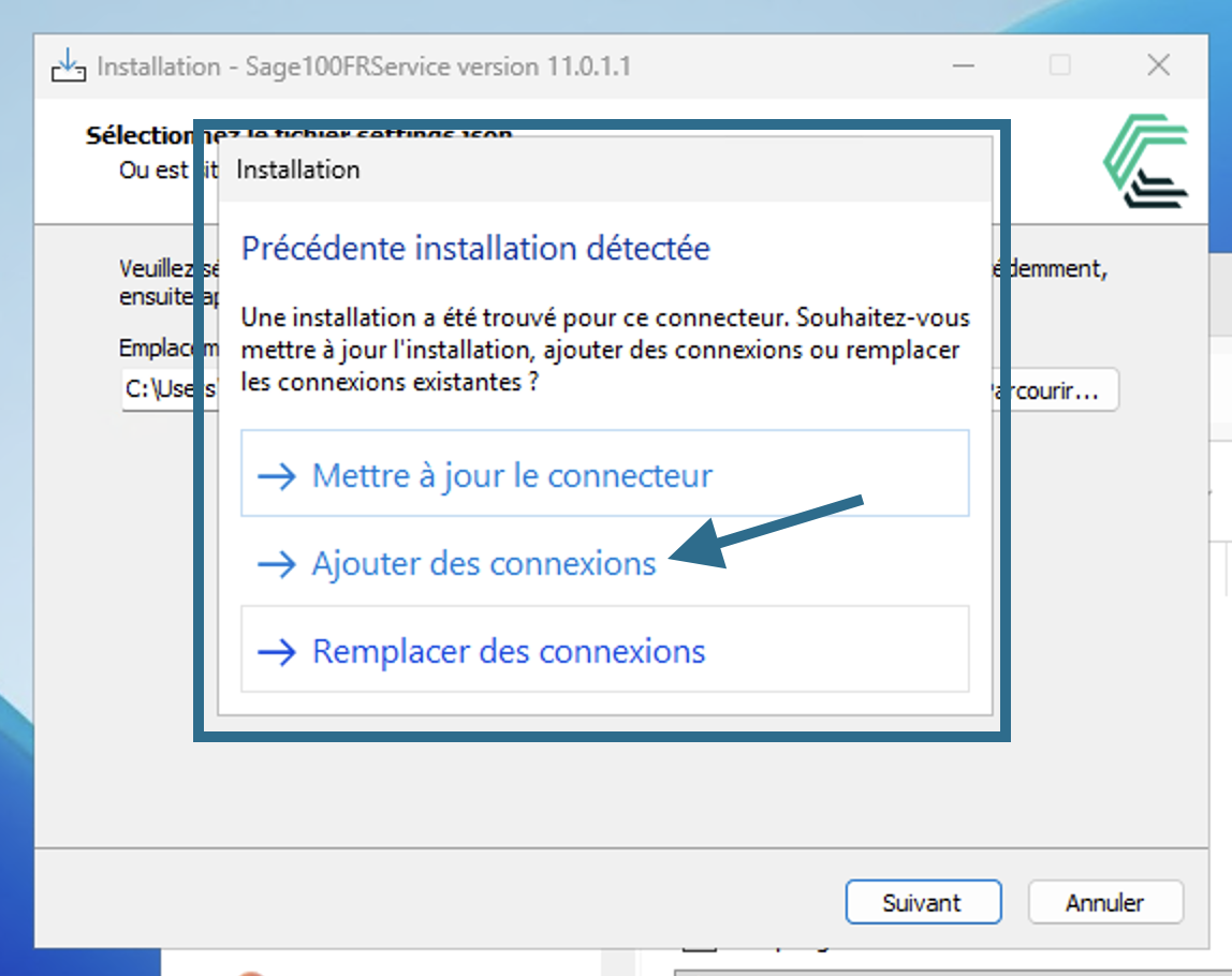Lors de l'installation décrite ici : Sage on premise ou là Sage 100 - Azure Sage Partner Cloud (SPC) une étape supplémentaire apparaitra sous forme de modale avec trois propositions (cf. image), Il vous faudra choisir l'option "Ajouter des connexions".