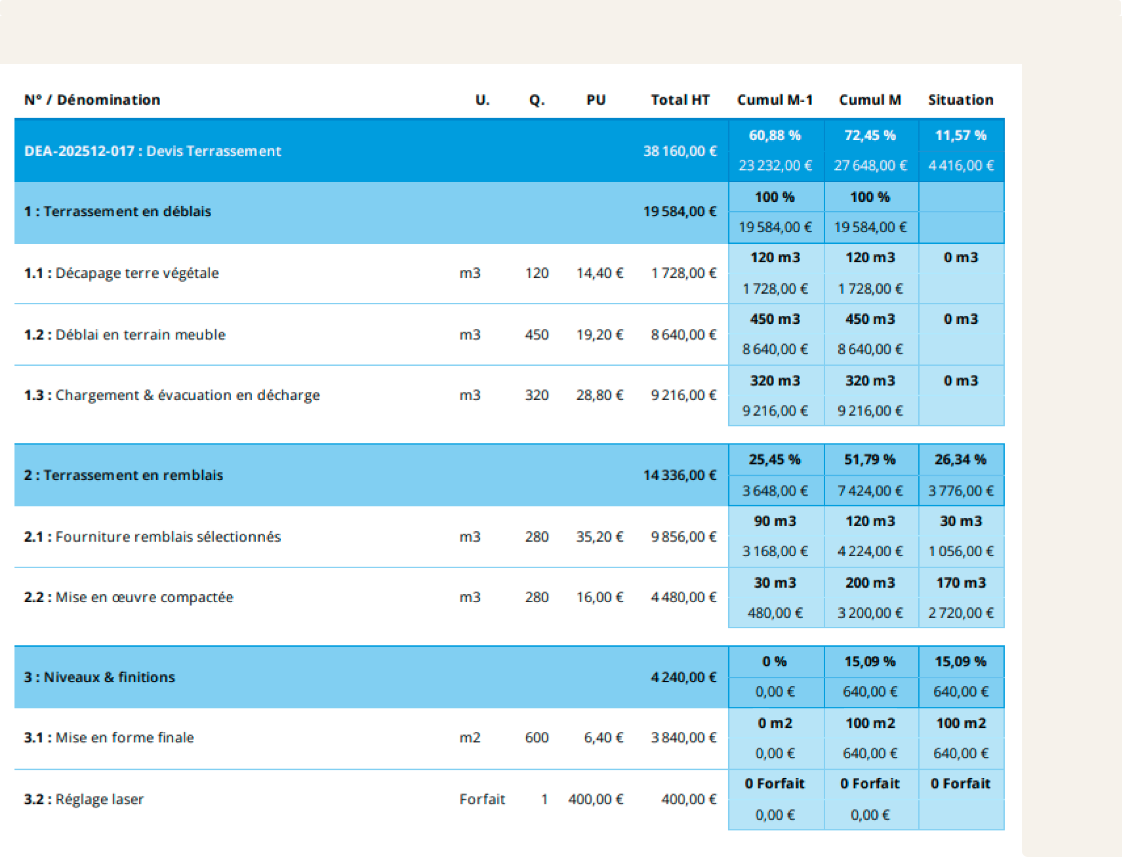 - En quantités : affiche l'avancement en unités réelles (ex : 45 m² sur 60 m²)