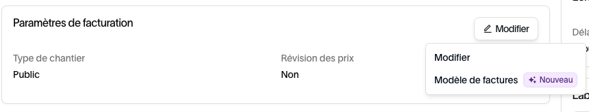 - Allez dans Chantier / Détail / Paramètres de facturation / Modifier / Modèle de facture
