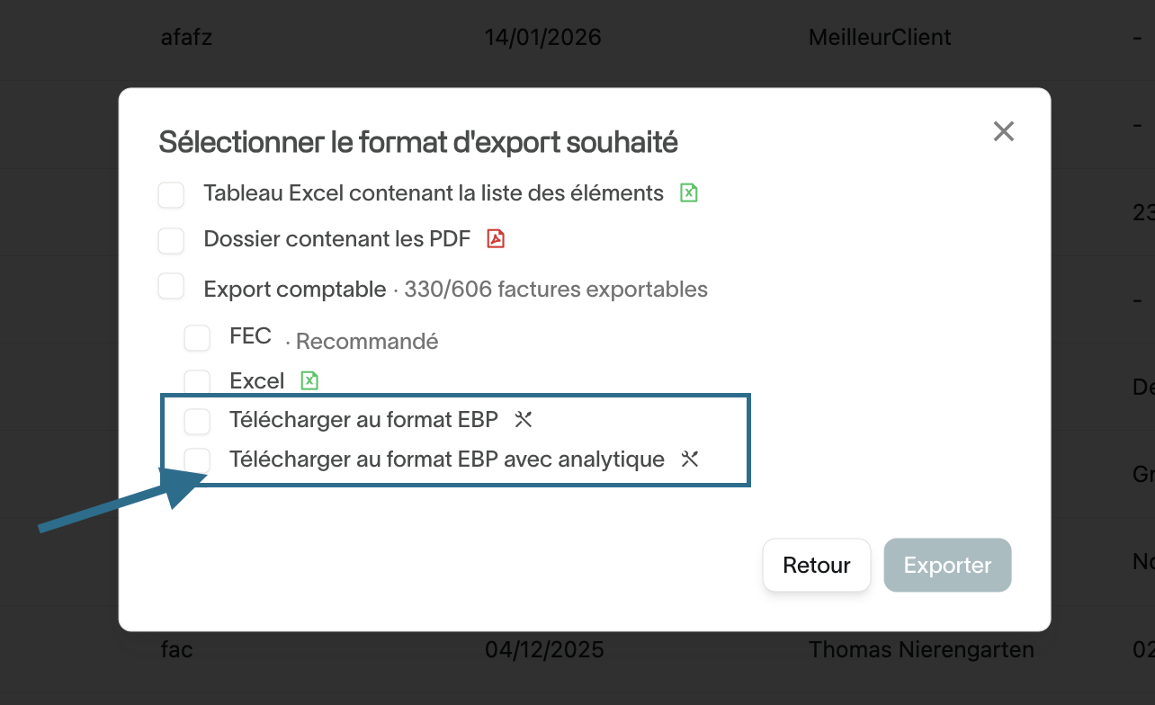 - Une modale s'ouvre puis sélectionnez "Télécharger au format EBP" ou "Télécharger au format EBP avec analytique"