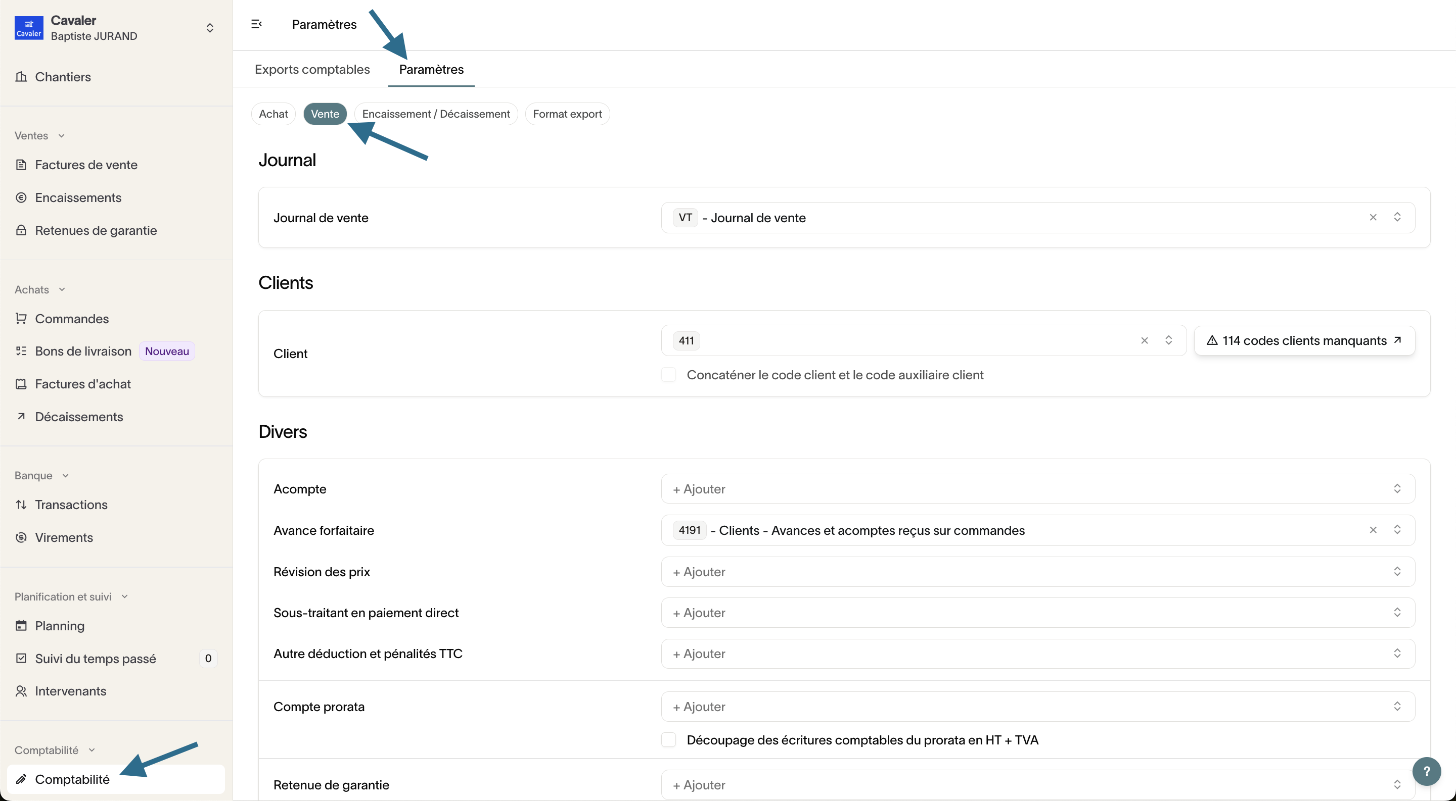 - Aller dans l'onglet "Comptabilité" > "Paramètres" > "Vente"