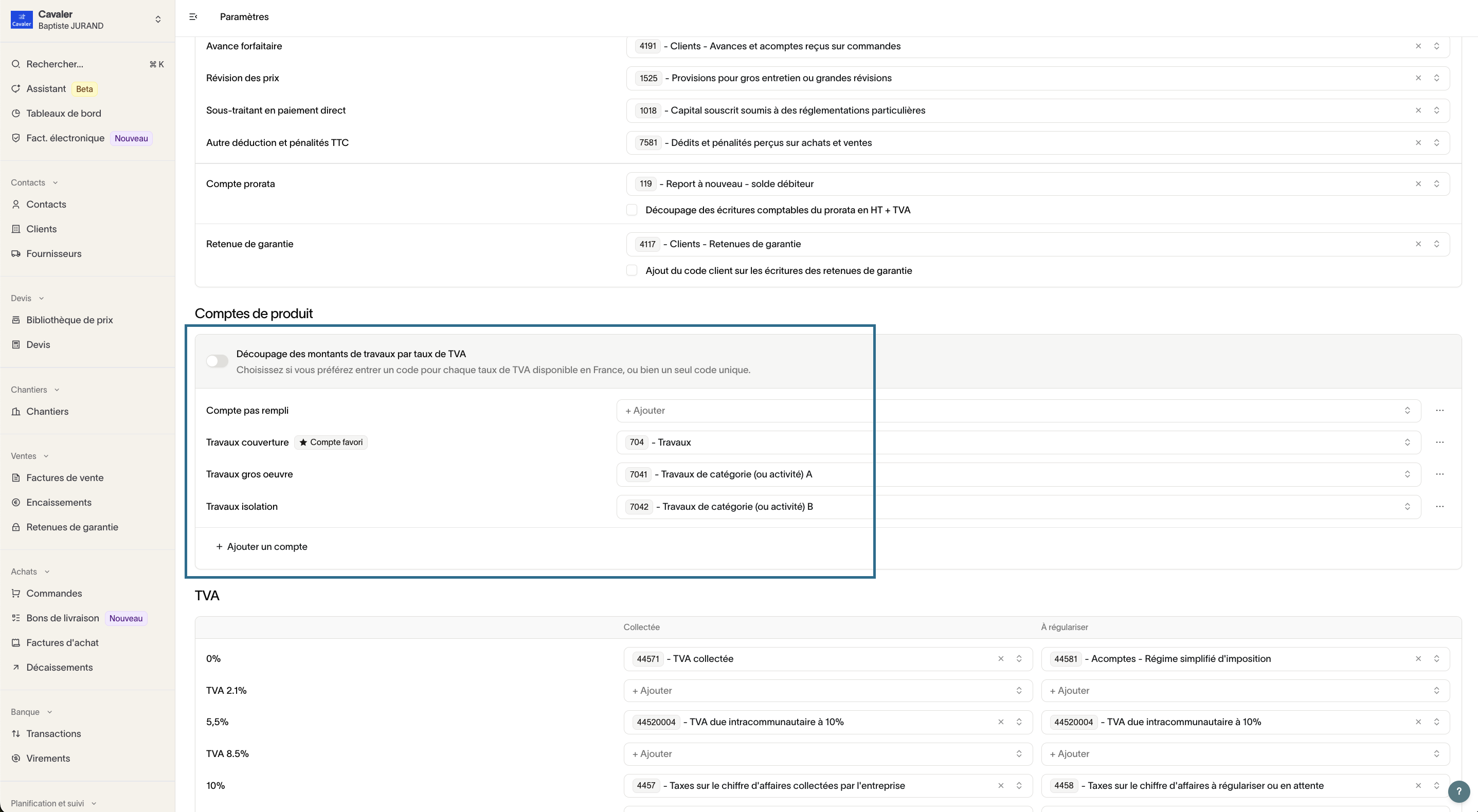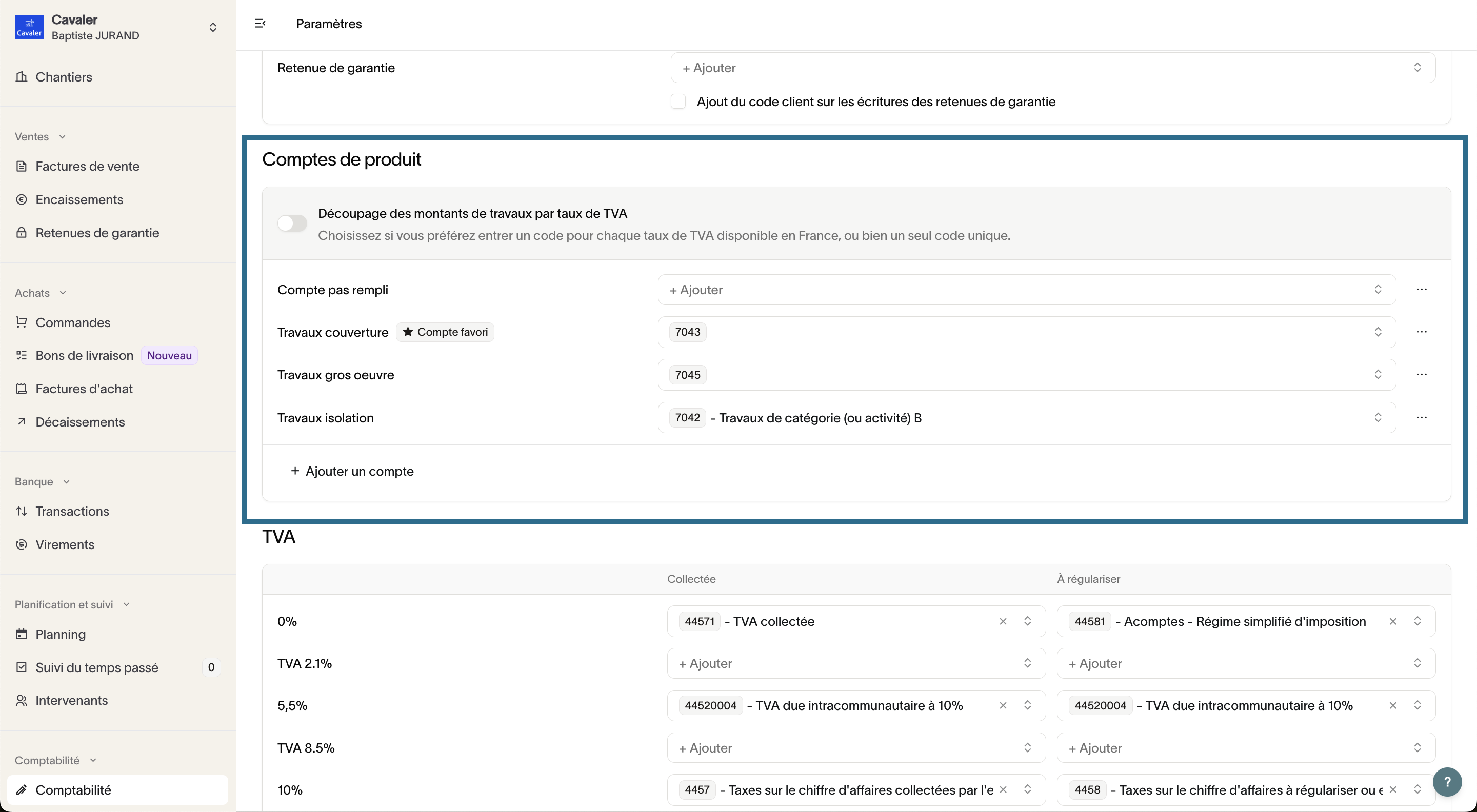 Pour un suivi plus précis de vos comptes travaux, Graneet vous donne la possibilité d'affiner votre découpage de comptes de classe 7 en fonction des taux de TVA